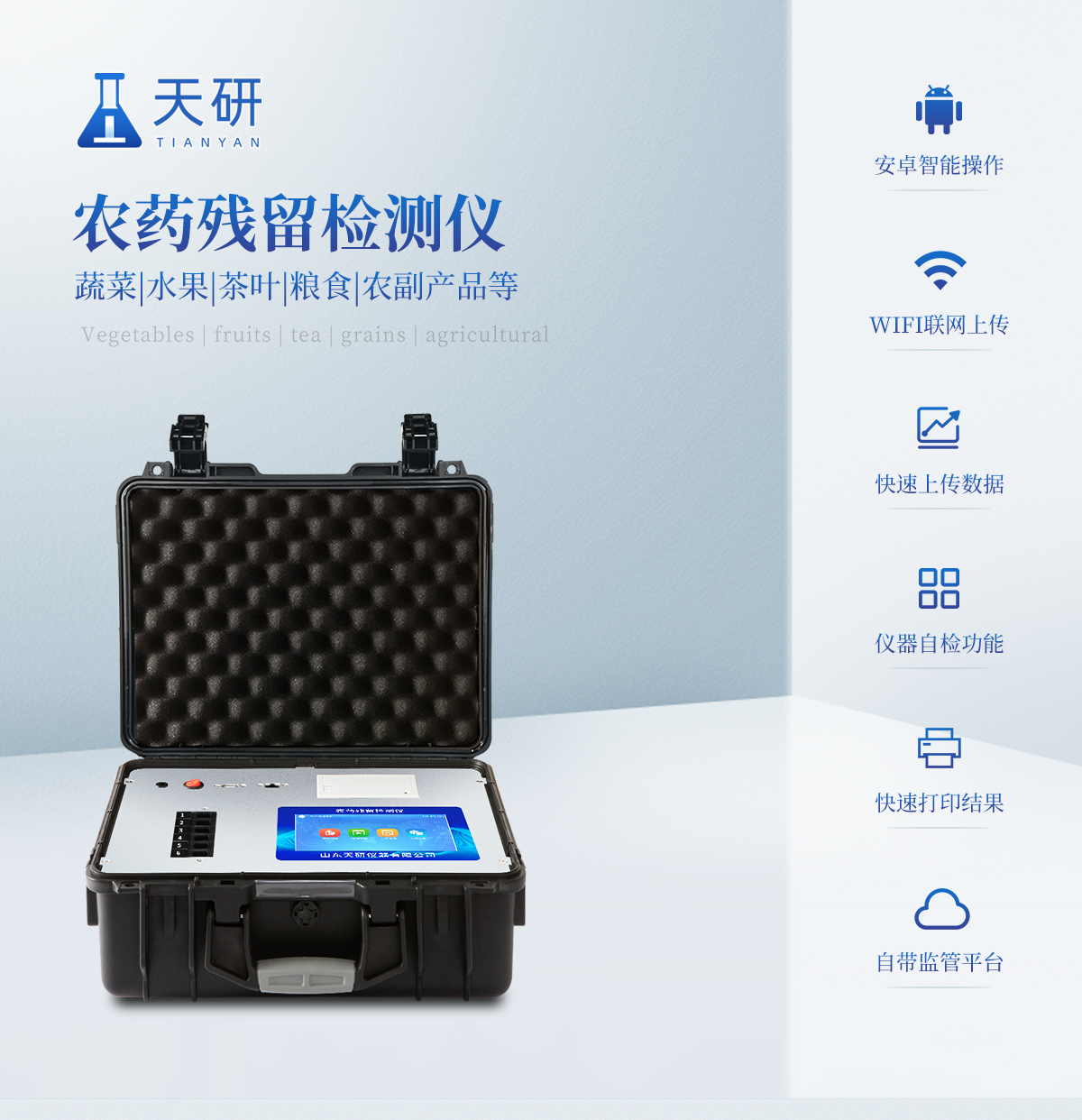 | 隨著人民生活水平的不斷提升,市場對茶葉的把控愈加嚴格。針對現狀,我司專門研發生產--茶葉專用的農藥殘留速測儀;定位茶農、茶商、茶葉企業使用。 此外還可用于果蔬茶生產基地和農貿批發銷售市場現場檢測,餐館、學校、食堂、家庭果蔬加工前的安全速測等。 | 檢測通道: 5個檢測通道,可以同時測試多個樣品,每個樣品由程序控制分別獨立工作,不會互相干擾。 | 顯示方式:≥5英寸液晶觸摸屏顯示,人性化中文操作界面,讀數直觀、簡單。 | 配備嵌入式高速熱敏打印機,可選擇手動打印或者自動打印,三分鐘出打印結果。 | 光源采用進口超高亮發光二極管,具有低功耗、穩定性強、高靈敏度,高檢測精度,高重復性精度,光源可控、響應速度快等優點。 | 采用標準USB接口設計,免驅動安裝,方便數據的存貯和移動,并可隨時與計算機直接相連,并且可用計算機控制儀器。實現數據查詢、瀏覽、分析、統計、打印等。 | 智能化程度高,儀器具有自檢功能:具有開機自檢和調零功能,具有自動檢測重復性功能 | 內置強大的數據庫,可在儀器上直接選擇樣品名稱、檢測指標、送檢單位等信息,也可在儀器上直接編輯錄入樣品名稱、檢測指標、送檢單位等信息并保存進樣品數據庫。 | 支持Wifi網絡,數據可局域網和互聯網數據上傳,檢測結果直接傳至食品安全監管平臺。進行區域食品安全監管及大數據分析處理,檢測區域食品安全長短期動態,達到食品安全問題預估、預警 |