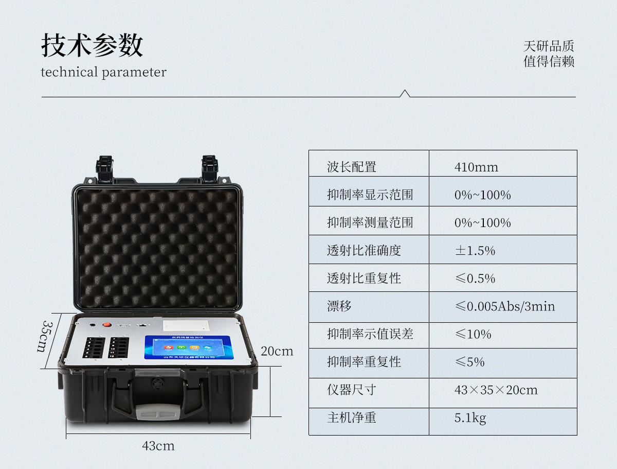 | 主控芯片采用32位處理器,運轉速度更快,穩定性強。 | 直流12V供電,可連接車載電源。 | 光源亮度自動調節與校準 | 脈沖式恒流驅動,避免連續發光引起光衰和溫漂。 | 可設置密碼登錄 | 不間斷進樣,連續檢測 | 樣本編號自動累加。 | 檢測項目可擴充。 | 檢測結果可批量打印,批量上傳。 | 檢測結果為Excel表格,連接電腦即可拷貝。 | 檢測結果存儲容量20萬條 | 固件可升級 |