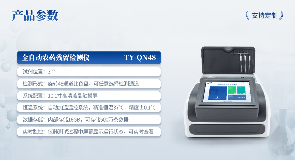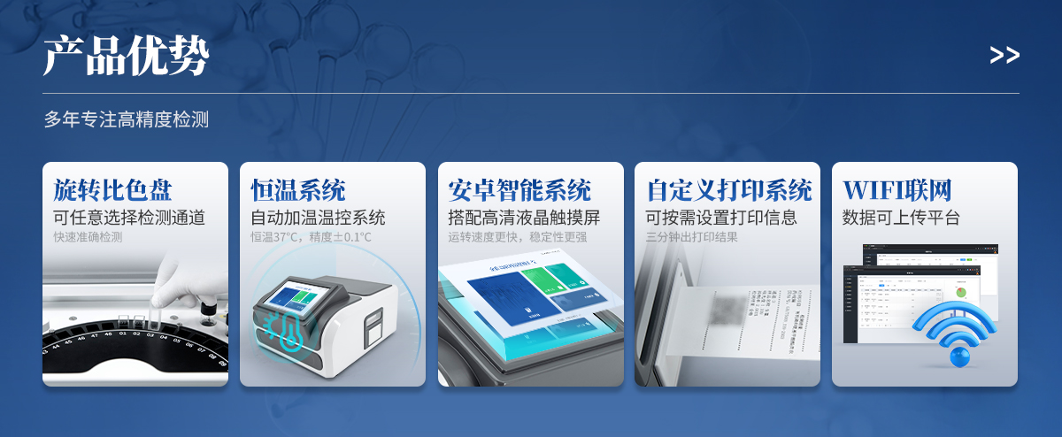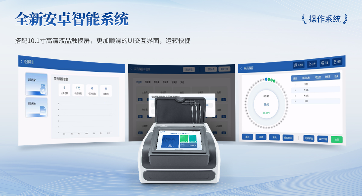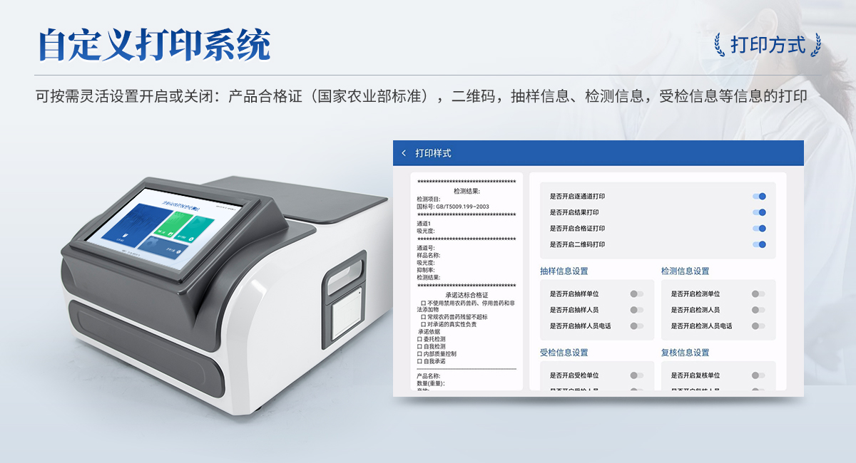 1. 試劑位置:3個2. 檢測形式:旋轉48通道比色盤,可任意選擇檢測通道,自動對應選擇通道。3. 系統配置:10.1寸高清液晶觸摸屏,采用ARM Cortex-A7,RK3288/4核處理器,運行內存1GB。Android7.1.1 系統分辨率1280×800。4.恒溫系統:具有自動加溫溫控系統,精準恒溫37℃,精度±0.1℃。5.添加系統:儀器按照試劑要求自動、按時、按量加入試劑,并且自動對未正常放置的樣本或異常的樣本進行檢查并提示。 6.清洗功能:儀器具備回流及自動清洗管路功能,避免試劑污染。7.混勻功能:設備具備自動混勻功能。8.光源校準:設備可自動校準,確保檢測準確度。9.實時監控:儀器測試過程中屏幕顯示運行狀態,可實時查看。10.數據存儲:內部存儲16GB,可存儲500萬條數據。11.樣品多選功能:設備具備樣品一鍵多選功能,選擇樣品自動匹配檢測通道。12.項目預設:可提前設置單個及多個相同或不相同的檢測任務,可單次或者多次調取,減少檢測時間。13.自定義打印系統:內置自定義打印系統,可按需靈活設置開啟或關閉:產品合格證(國家農業部標準),二維碼,抽樣信息、檢測信息,受檢信息等信息的打印。14.A4版本報告打印功能:設備可自動生成A4版報告,A4報告帶二維碼,可掃描二維碼生成電子版,并可識別真偽。15.傳輸方式:儀器配備無線通信模塊: 4G(APN)通訊模塊、Wifi模塊,藍牙傳輸模塊,同時具有USB接口以及RJ45接口能以多種方式實現數據保存和數據傳輸功能,設備數據可以同步上傳至平臺。16.數據監管系統:設備自帶監管平臺,并可同步對接監管平臺,數據可局域網和互聯網數據上傳,檢測結果可直接傳至食品安全監管平臺。達到食品安全問題預估、預警。17.系統遠程更新功能:無需設備返廠,即可遠程實時升級全新系統,節省時間成本及避免運輸造成設備損。
