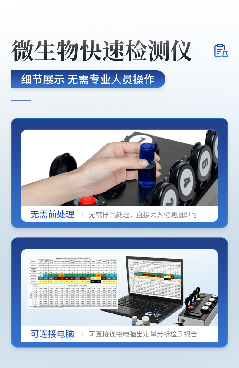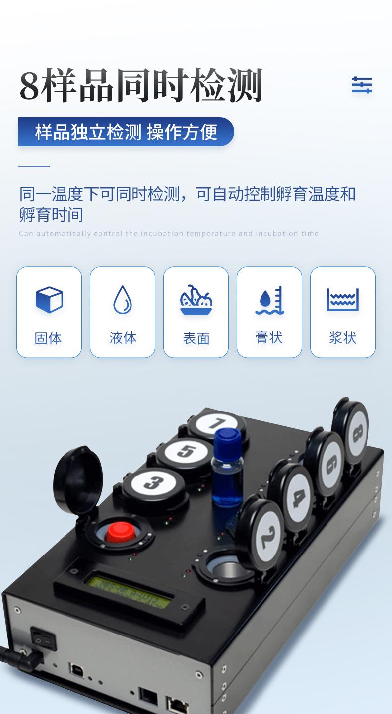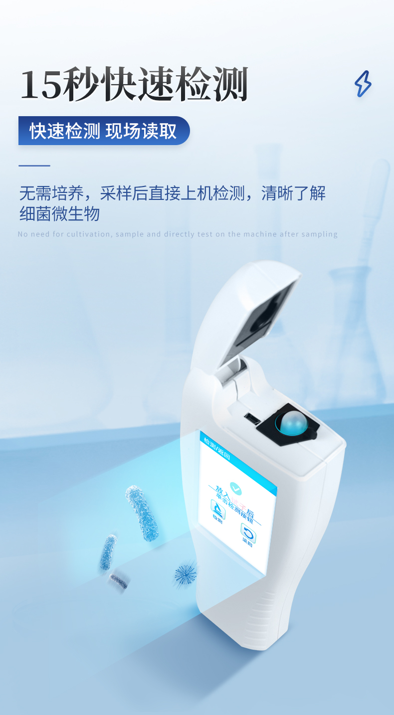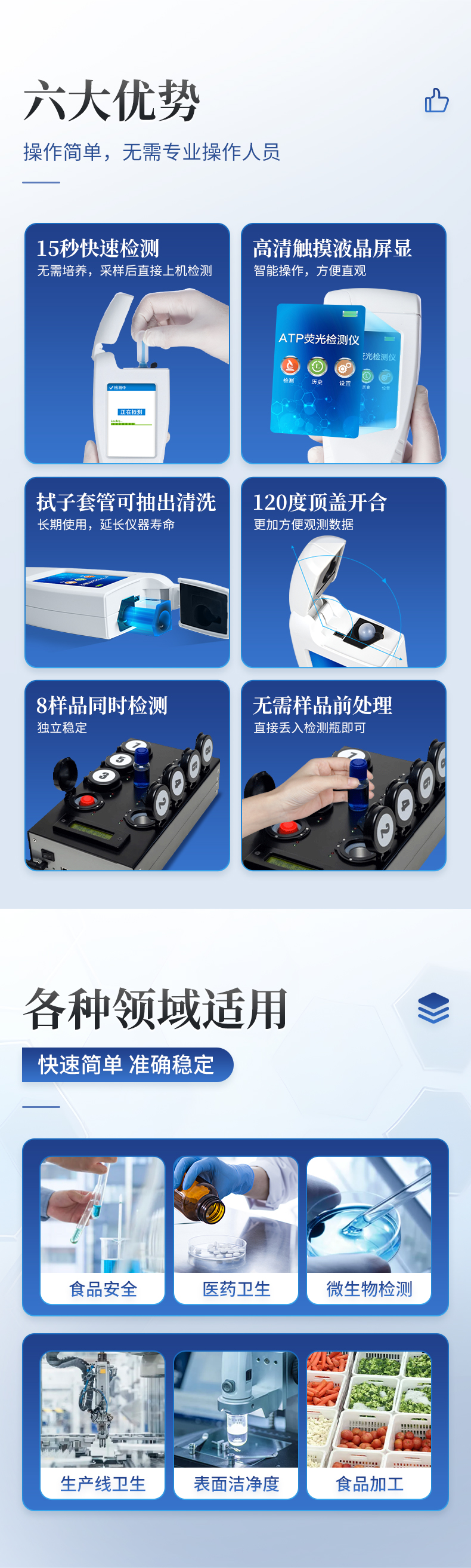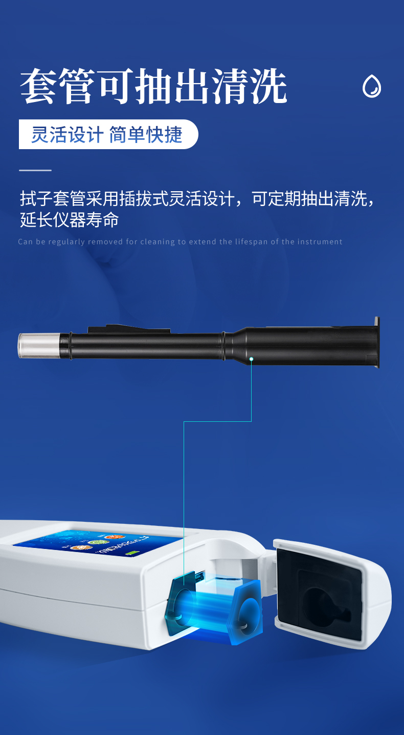 實(shí)用性 —— 可根據(jù)環(huán)境檢測(cè)需求設(shè)定上下限值,做到數(shù)據(jù)快速評(píng)估預(yù)警,表面潔凈度快速篩查。靈敏度高 —— ***************速度快 —— 常規(guī)培養(yǎng)法18-24h以上,而ATP只需要十幾秒鐘 .可行性 —— 微生物數(shù)量與微生物體內(nèi)所含ATP有明確的相關(guān)性。 通過(guò)檢測(cè)ATP含量,可間接得出反應(yīng)中微生物數(shù)量可操作性 —— 傳統(tǒng)培養(yǎng)方法需要在實(shí)驗(yàn)室由經(jīng)過(guò)培訓(xùn)的技術(shù)人員進(jìn)行操作;而ATP快速潔凈度檢測(cè)操作非常簡(jiǎn)便,只需簡(jiǎn)單的培訓(xùn)即可由一般工作人員進(jìn)行現(xiàn)場(chǎng)操作。體驗(yàn)更好 —— 試子套管采用插拔式靈活設(shè)計(jì),可定期清洗長(zhǎng)期使用,延長(zhǎng)儀器壽命。