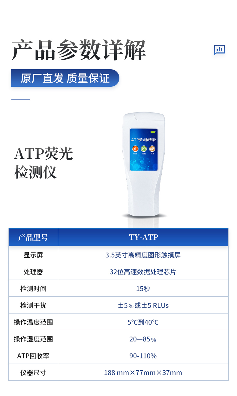 該設(shè)備為全新升級(jí)產(chǎn)品,大屏幕觸摸顯示屏,代替?zhèn)鹘y(tǒng)按鍵。操作采用生物化學(xué)反應(yīng)方法檢測(cè)ATP含量,ATP熒光檢測(cè)儀基于螢火蟲發(fā)光原理,利用“熒光素酶—熒光素體系”快速檢測(cè)三磷酸腺苷(ATP)。ATP拭子含有可以裂解細(xì)胞膜的試劑,能將細(xì)胞內(nèi)ATP釋放出來(lái),與試劑中含有的特異性酶發(fā)生反應(yīng),產(chǎn)生光,再用熒光照度計(jì)檢測(cè)發(fā)光值,微生物的數(shù)量與發(fā)光值成正比,由于所有生物活細(xì)胞中含有恒量的ATP,所以ATP含量可以清晰地表明樣品中微生物與其他生物殘余的多少,用于判斷衛(wèi)生狀況。